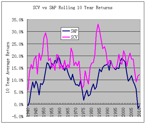 To answer their question, I did a 10-year rolling return comparison between the Fama/French Small Cap Value (SCV) and the S&P 500 index using data from 1931 to 2010. The first 10-year period is 1931 to 1940, the second is 1932 to 1941, and the last is 2001 to 2010. Here is the rolling return chart I got.