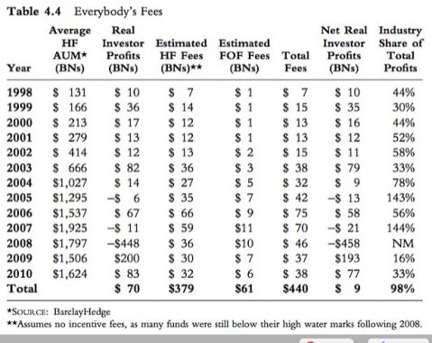 Not everybody has time to read books like this, but if you are ever approached by a hedge fund peddler – I get calls every week about an amazing alternative investment opportunity – at least look at the table below before you part with your money.