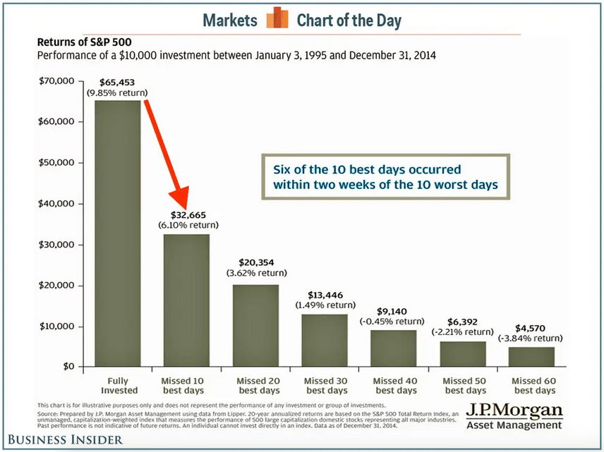 Below is research from JP Morgan that I found on the internet. You can see that between 1995 and 2014, the annual return of the S&P 500 is 9.85% if invested through the whole duration. But missing just the 10 best days would drop the annual return to only 6.1%. Missing the 20 best days would drop the annual return to 3.62%. Missing the best 30 days would further drop the annual return to only 1.49%.