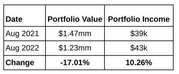 Did I do some kind of magic trick? No, I simply showed him what was hidden in his portfolio statements. I compared not just the value of his portfolio, but also his projected yearly portfolio income between August of last year to this August. Here is the comparison table.