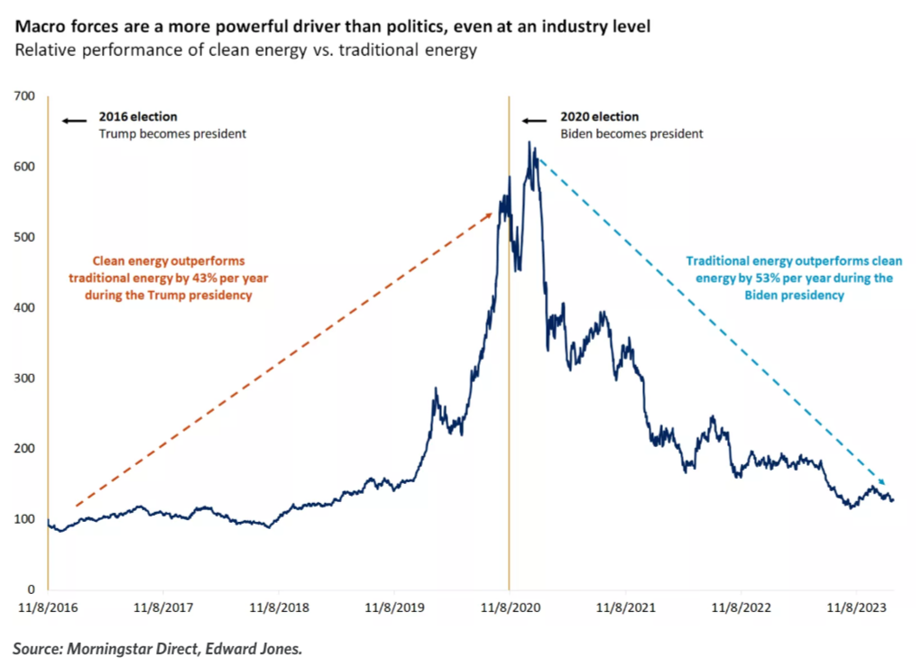 See the chart below, during the Trump administration, renewal energy stocks outperformed traditional energy stocks by 43%; during the Biden administration, renewal energy stocks underperformed traditional energy stocks by 53%. If you had picked stocks based on presidential preferences, you would have been screwed left and right, literally.