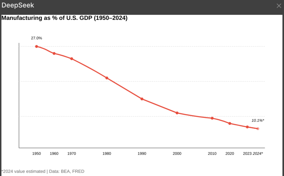 Exporting dollars is a great business to have, since instead of goods, which requires costly manufacturing, dollars can be created by simply adding an entry into the Fed’s computer system. However, a side effect is, that nobody wants to invest in manufacturing and no young people want to work in factories. All smart kids want to be in finance, the industry that is closely related to money creation, allocation, and management. This has led to overfinancialization and the gradual deindustrialization of the country (See chart below.)